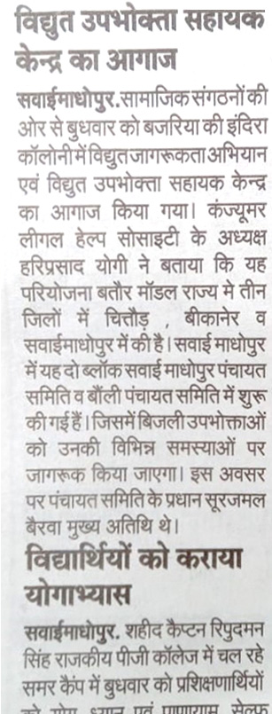 A few highlights from the launch of three Consumer Assistance Cells in Rajasthan—the first in Bajju village of Kolayat, Bikaner, the second jointly for Chittorgarh and Bhadesar blocks, and the third in Sawai Madhopur block. The launches were well covered in the local media.